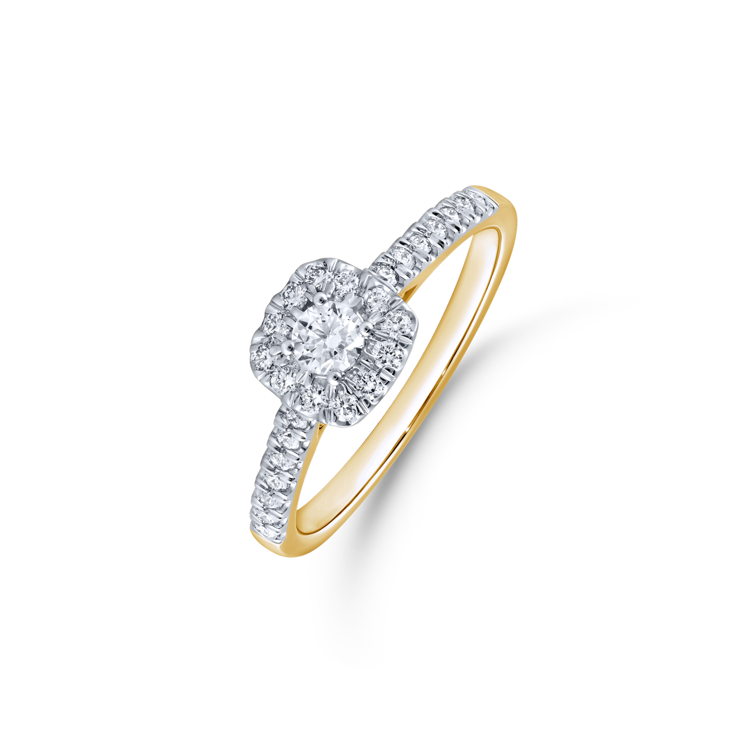 Smuk ring i 14 kt. guld med firkantet top med 1 stor og 26 små brillanter omkring og ned ad ringskinnen.