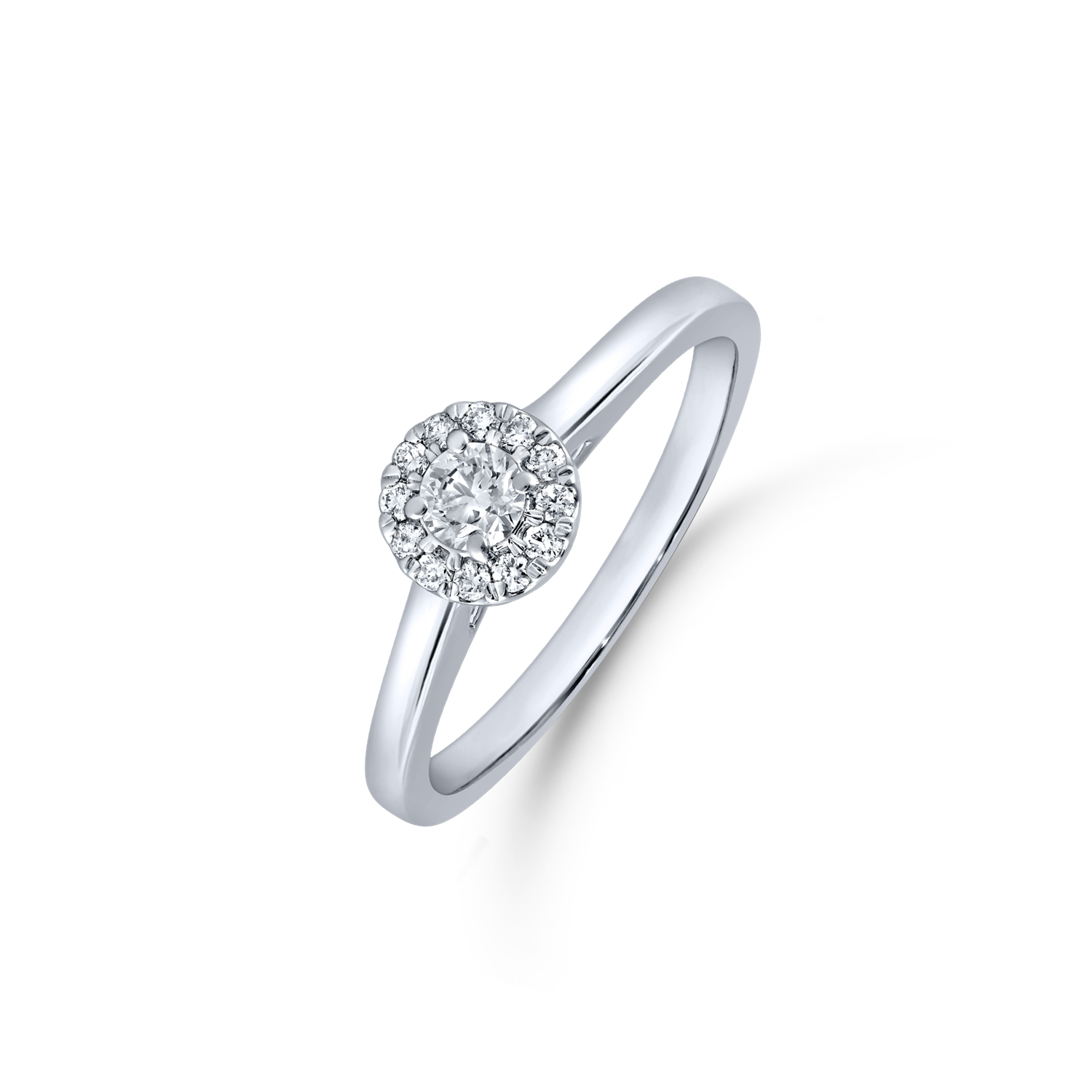 Smuk 14 kt. hvidgulds ring med cirkel med 1 stor og 12 små brillanter omkring.