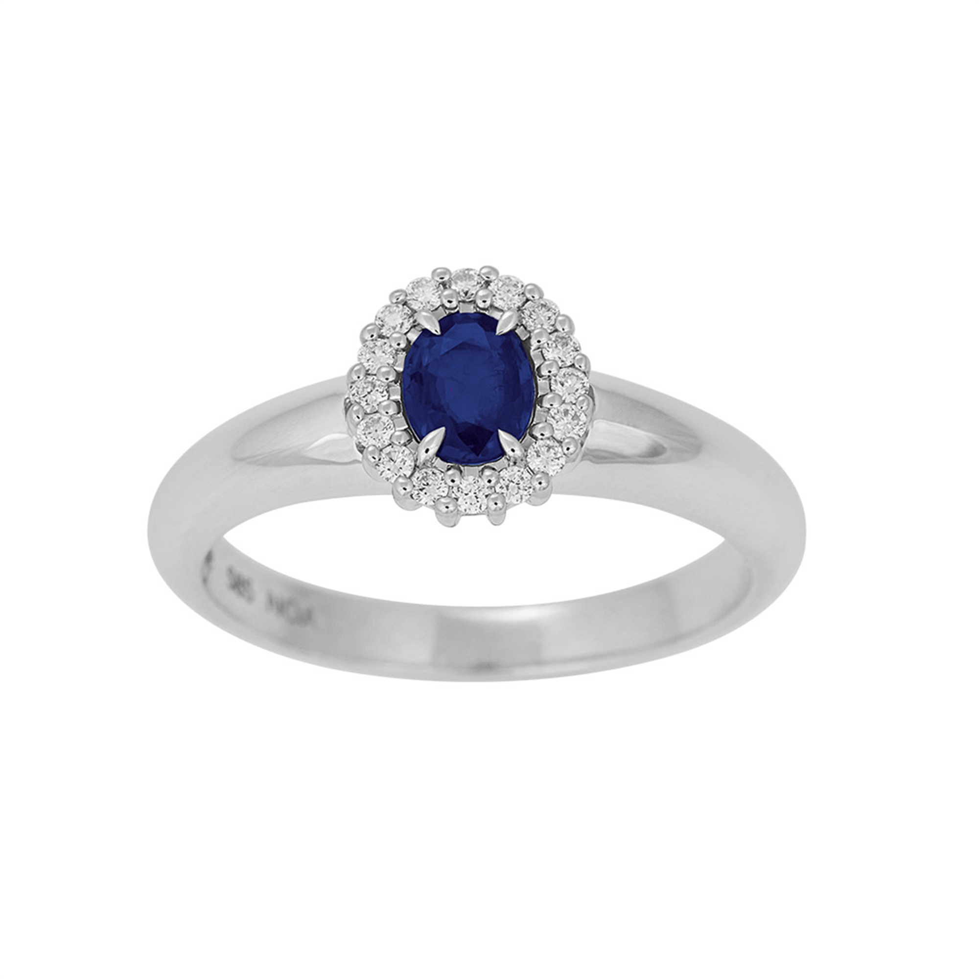 14 kt. guldring m/safir og dia 0.11ct W/SI, fra Siersbøl