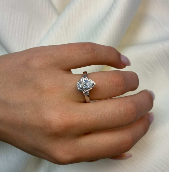 14 karat hvidgulds diamant ring med ialt 1,45 ct lab grown diamanter TW/VS - 1 ct dråbe formet center sten med ialt 0,45 ct diamanter rundt om center stenen og på ringskinne.