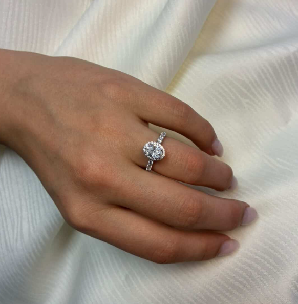 14 karat hvidgulds diamant ring med ialt 1,52 ct lab grown diamanter TW/VS - 1 ct oval center sten med ialt 0,52 ct diamanter rundt om center stenen og på ringskinne.