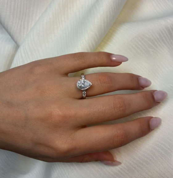 14 karat hvidgulds diamant ring med ialt 1,32 ct lab grown diamanter TW/VS - 1 ct dråbe formet center sten med ialt 0,32 ct diamanter rundt om center stenen og på ringskinne.