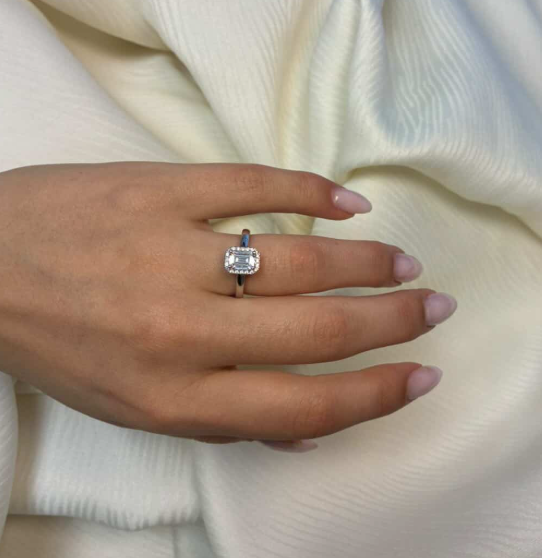 14 karat hvidgulds diamant ring med ialt 1,12 ct lab grown diamanter TW/VS - 1 ct kvadratisk center sten med ialt 0,12 ct diamanter rundt om center stenen og på ringskinne.