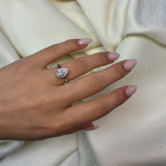 14 karat hvidgulds diamant ring med ialt 1,12 ct lab grown diamanter TW/VS - 1 ct dråbe formet center sten med ialt 0,12 ct diamanter rundt om center stenen og på ringskinne.