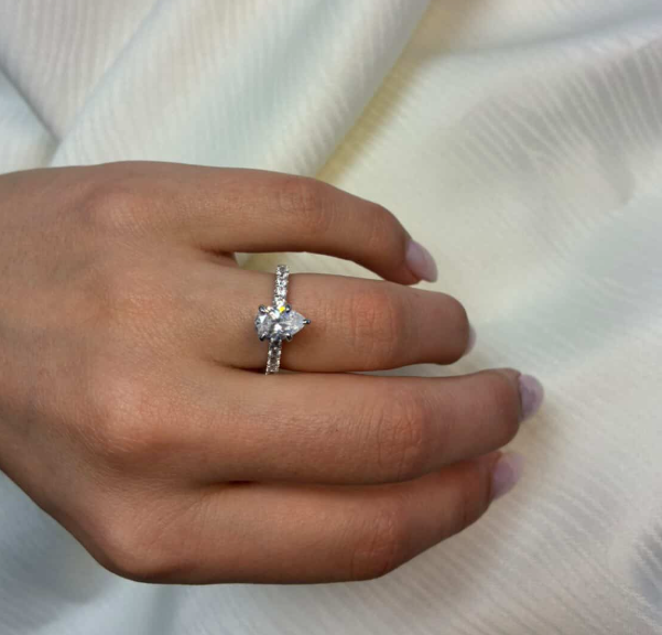 14 karat hvidgulds diamant ring med ialt 1,4 ct lab grown diamanter TW/VS - 1 ct dråbe formet center sten og 10 sten på ringskinne.