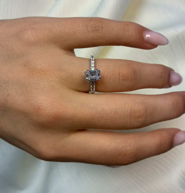 14 karat hvidgulds diamant ring med ialt 1,4 ct lab grown diamanter TW/VS - 1 ct firkantet center sten og 10 sten på ringskinne.