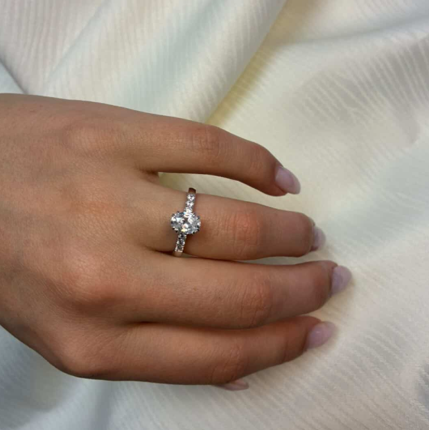 14 karat hvidgulds diamant ring med ialt 1,2 ct lab grown diamanter TW/VS - 1 ct oval center sten og 6 sten på ringskinne.