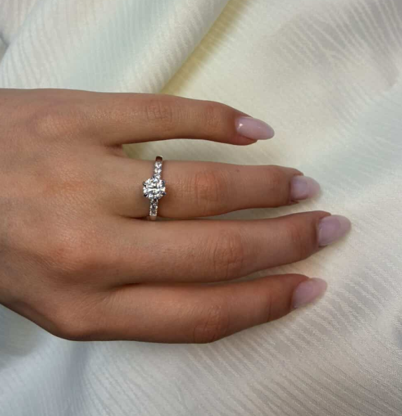 14 karat hvidgulds diamant ring med ialt 1,2 ct lab grown diamanter TW/VS - 1 ct rund center sten og 6 sten på ringskinne.