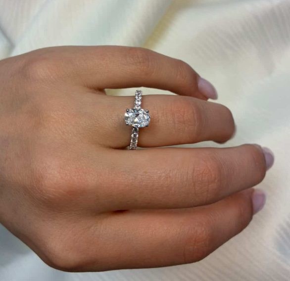 14 karat hvidgulds diamant ring med ialt 1,4 ct lab grown diamanter TW/VS - 1 ct oval center sten og seks diamanter ned af begge sider på ringskinnen alle fattet i classic 4 grab fatning.