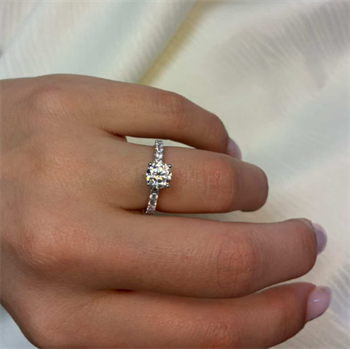 14 karat hvidgulds diamant ring med ialt 1,4 ct lab grown diamanter TW/VS - 1 ct rund center sten og seks diamanter ned af begge sider på ringskinnen alle fattet i classic 4 grab fatning.