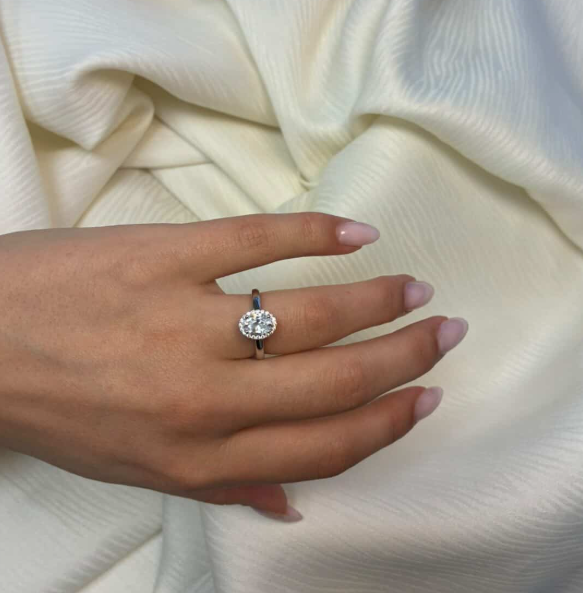 14 karat hvidgulds diamant ring med ialt 1,12 ct lab grown diamanter TW/VS - 1 ct oval center sten med ialt 0,12 ct diamanter rundt om center stenen og på klassisk ringskinne.