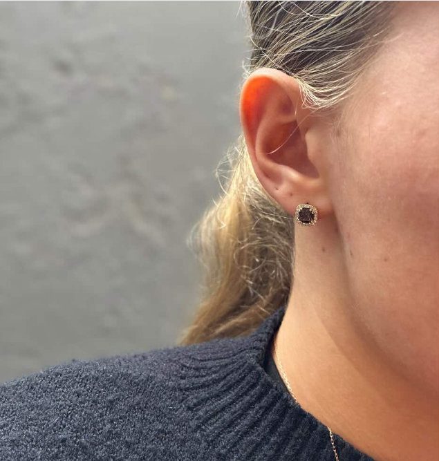 Grace smykkesættet med vedhæng, ørestikkere og ring er i 14 karat guld med Wesselton SI brillianter smukt fattet cushions af røgfarvet topaz
