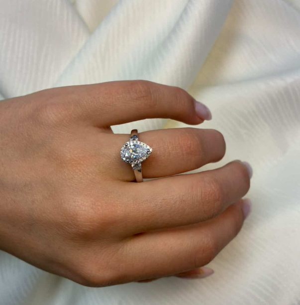 14 karat diamant ring med ialt 1,45 ct lab grown diamanter TW/VS - 1 ct dråbe formet center sten med ialt 0,45 ct diamanter rundt om center stenen og på ringskinne.