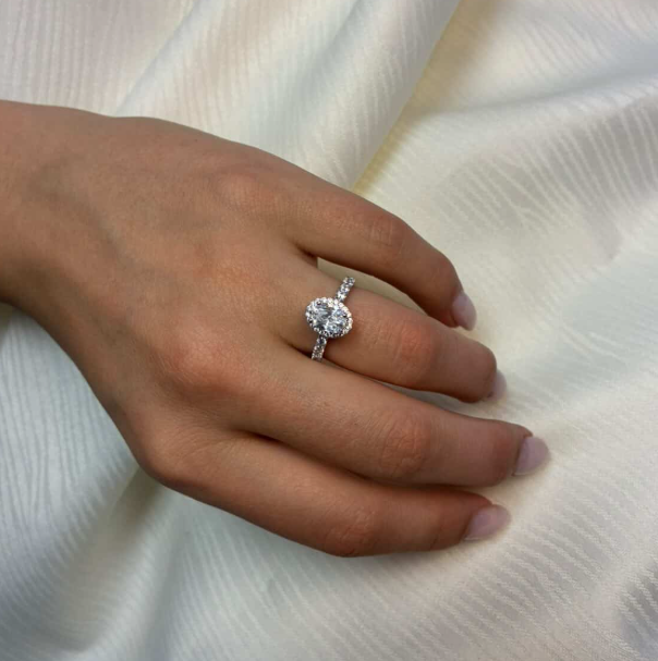 14 karat diamant ring med ialt 1,52 ct lab grown diamanter TW/VS - 1 ct oval center sten med ialt 0,52 ct diamanter rundt om center stenen og på ringskinne.