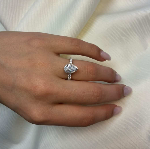 14 karat diamant ring med ialt 1,52 ct lab grown diamanter TW/VS - 1 ct dråbe formet center sten med ialt 0,52 ct diamanter rundt om center stenen og på ringskinne.