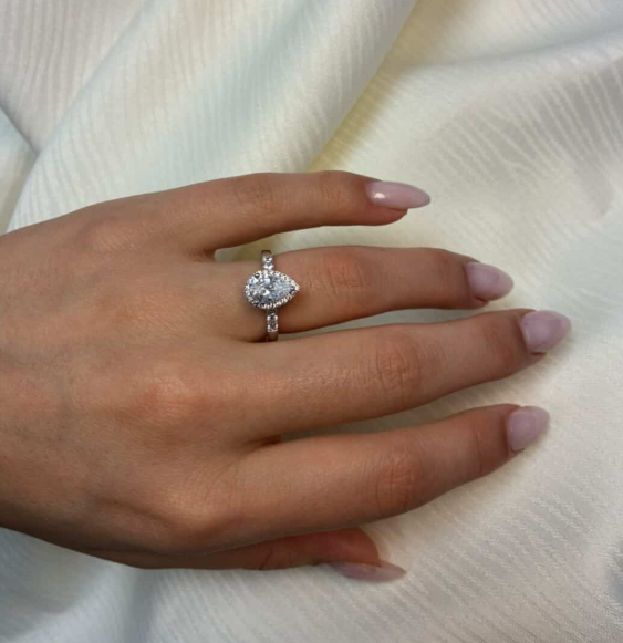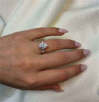 14 karat diamant ring med ialt 1,32 ct lab grown diamanter TW/VS - 1 ct dråbe formet center sten med ialt 0,32 ct diamanter rundt om center stenen og på ringskinne.
