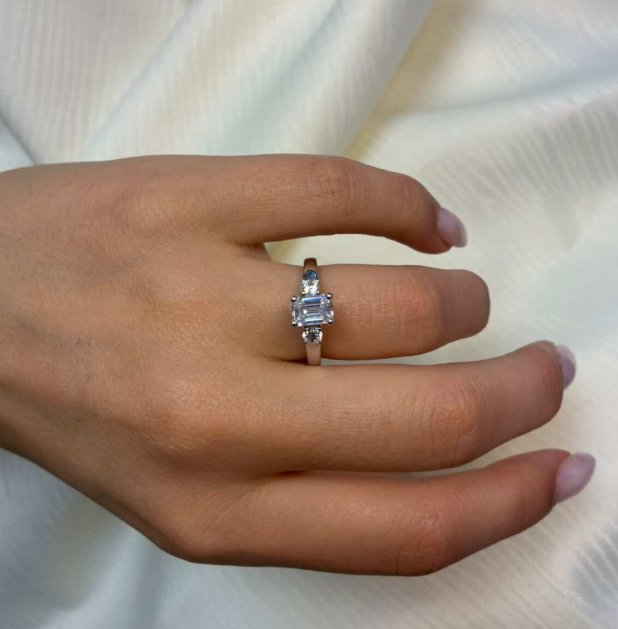14 karat guld diamant ring med ialt 1,33 ct lab grown diamanter TW/VS - 1 ct firkantet center sten og to diamanter på ringskinnen alle fattet i classic 4 grab fatning.