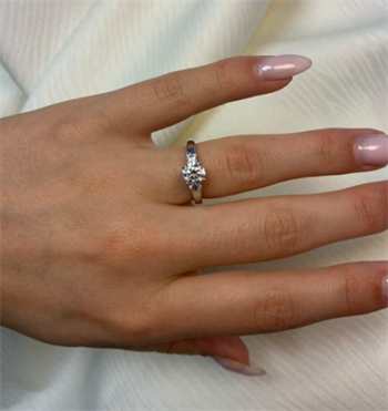 14 karat guld diamant ring med ialt 1,33 ct lab grown diamanter TW/VS - 1 ct rund center sten og to diamanter på ringskinnen alle fattet i classic 4 grab fatning.