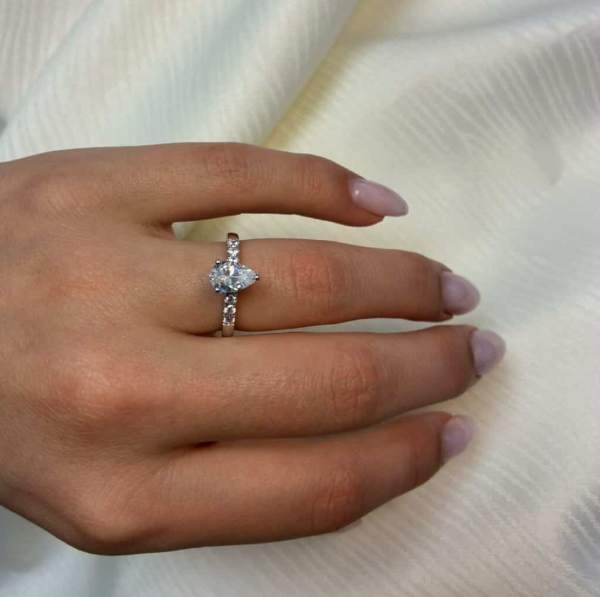 14 karat diamant ring med ialt 1,2 ct lab grown diamanter TW/VS - 1 ct dråbe formet center sten og tre diamanter ned af begge sider på ringskinnen alle fattet i classic 4 grab fatning.