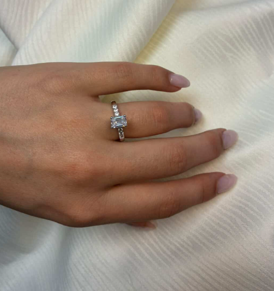 14 karat guld diamant ring med ialt 1,2 ct lab grown diamanter TW/VS - 1 ct firkantet center sten og tre diamanter ned af begge sider på ringskinnen alle fattet i classic 4 grab fatning.