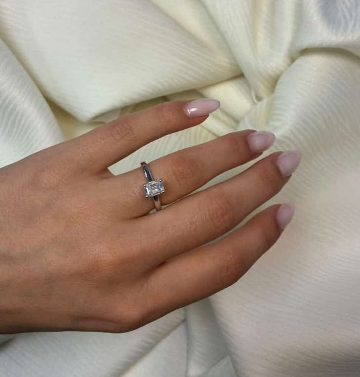 14 karat guld diamant ring med ialt 1,0 ct lab grown diamanter TW/VS - 1 ct firkantet center sten fattet i en classic 4 grab fatning - og helt glat ringskinne.