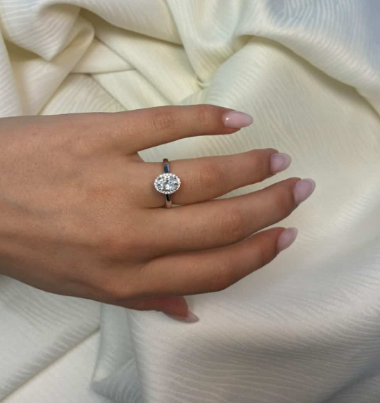 14 karat diamant ring med ialt 1,12 ct lab grown diamanter TW/VS - 1 ct oval center sten med ialt 0,12 ct diamanter rundt om center stenen og på klassisk ringskinne.