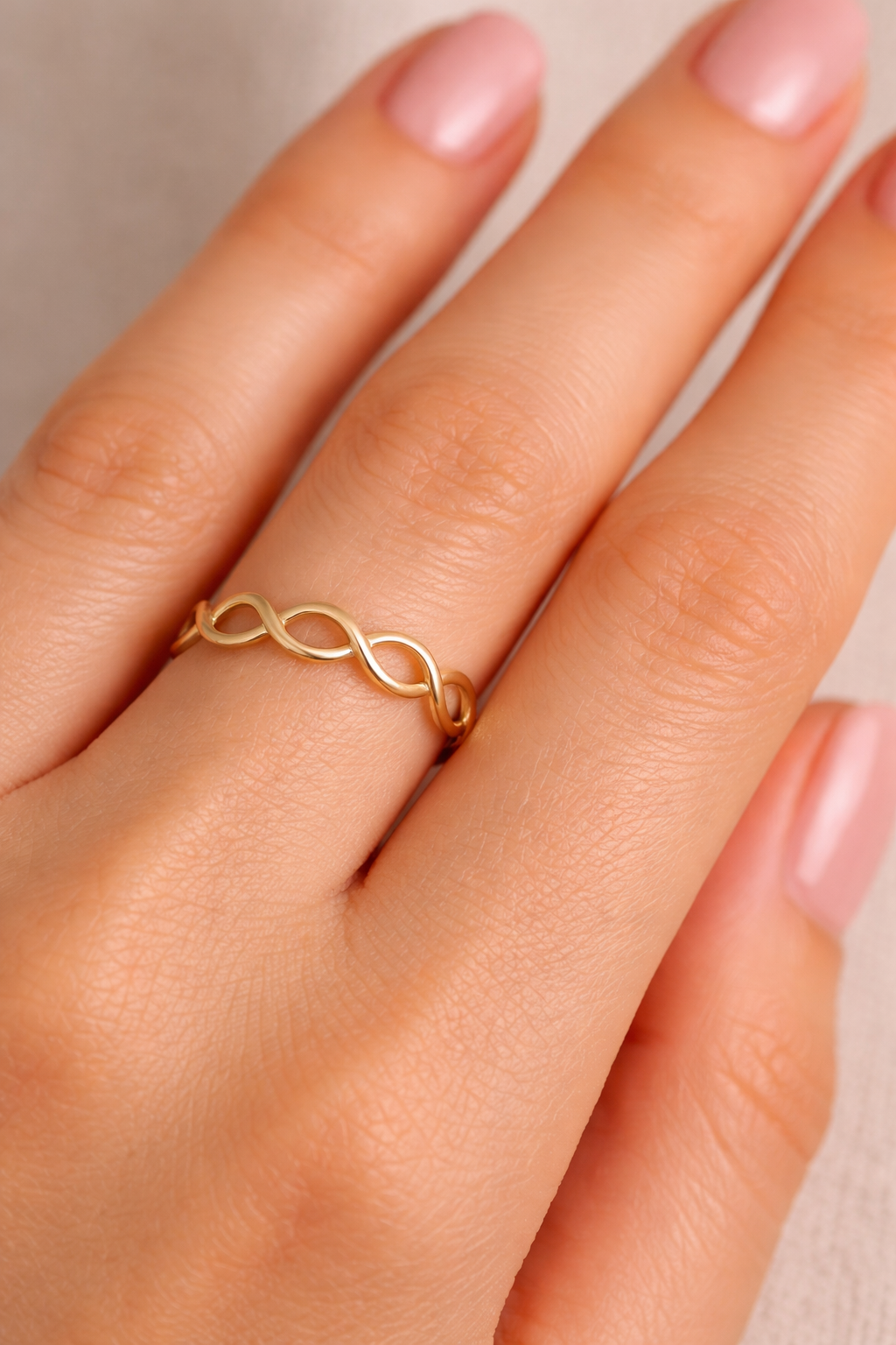 Med sin fine, simple linje, der snor sig i et uendelighedstegn, tilbyder denne ring en diskret, men alligevel fængende tilstedeværelse på din finger. Bær den alene for et underspillet look, eller kombiner den med andre ringe for at skabe din egen unikke stil.