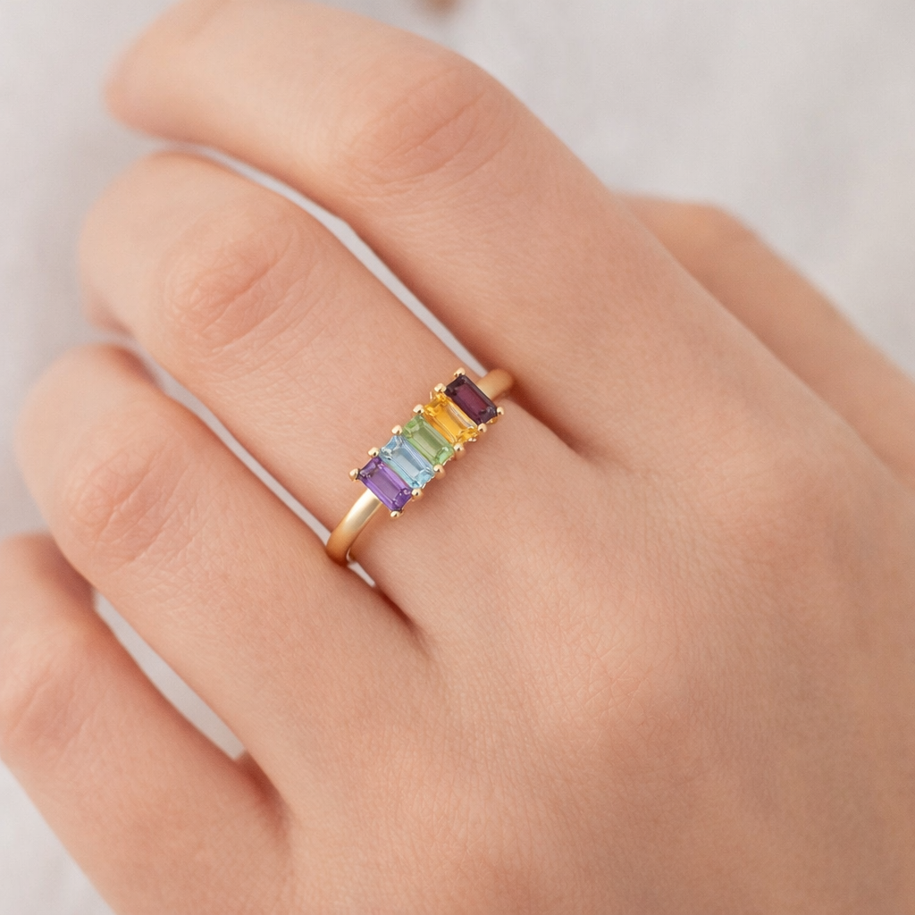 Ringens design udgør en harmonisk blanding af ædelsten som granat, blå topas, citrin, peridot og ametyst. Hver sten er formet som aflange firkanter, der elegant er indfattet i det skinnende guld. Disse sten er ikke kun bemærkelsesværdige for deres levende farver, men også for deres betydning og kraft.