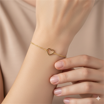 Udforsk skønheden og finessen ved vores eksklusive 8 kt hjerte guld armbånd, omhyggeligt designet af de anerkendte håndværkere hos Støvring Design. Dette delikate armbånd er fremstillet i ægte 8 karat guld, hvilket sikrer både holdbarhed og en strålende glans, der ikke falmer over tid. Dets elegante og minimalistiske design gør det til en perfekt gave til en, du holder af, eller som en luksuriøs tilføjelse til din egen smykkesamling.