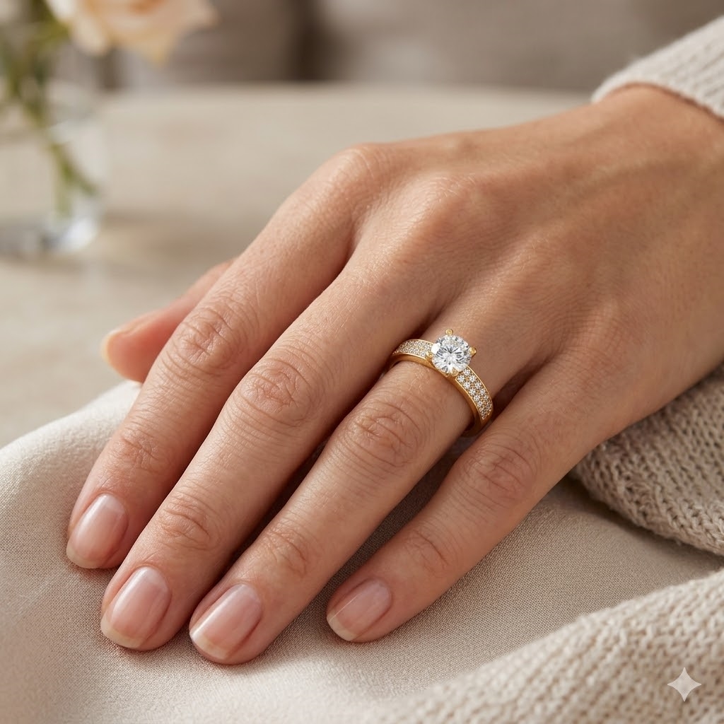 En elegant 8kt guldring med en stor, glitrende zirkonia i midten og mindre sten langs båndet.