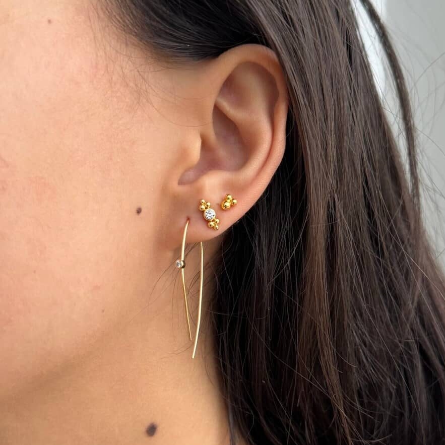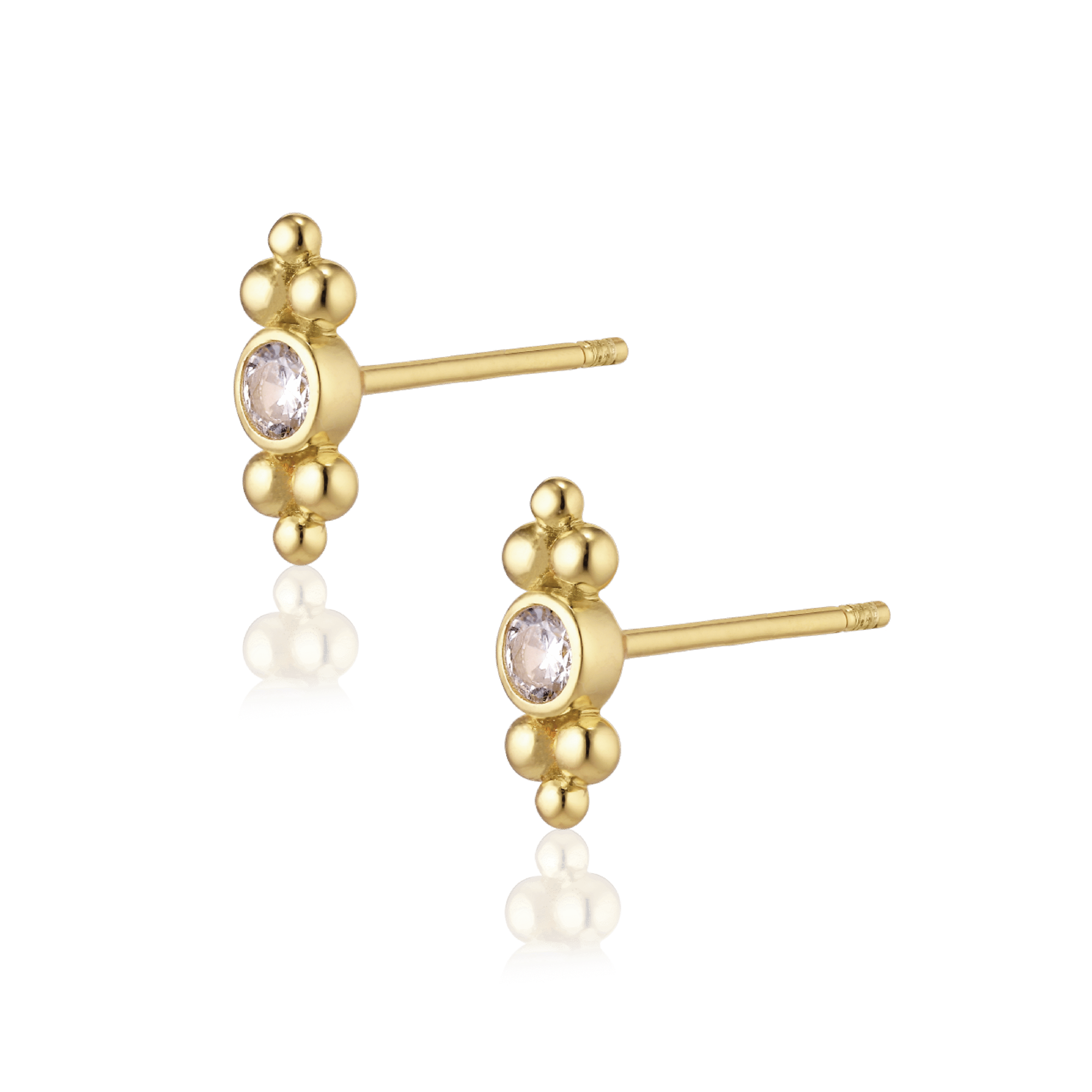 Elegant og klassisk ørestik fra Alura Copenhagens Eclipse-kollektion, inspireret af fascinerende sol- og måneformørkelser. Smykket er fremstillet i 925 sterlingsølv med 18 karat guldbelægning og dekoreret med en funklende facetslebne zirkoniasten på ca. 2,5 mm, som giver et sofistikeret og glamourøst udtryk. Ørestikken er ca. 9,5 mm høj og 3,7 mm bred – perfekt som et diskret hverdags-smykke eller som del af en stilfuld ørestak.