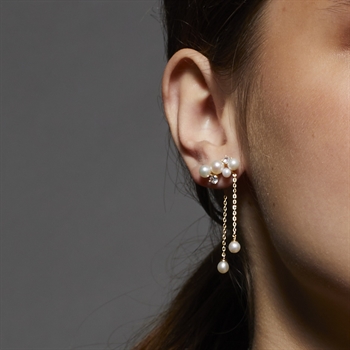 Delikat og elegant ørestik fra Alura Copenhagens Eclipse-kollektion, inspireret af mystiske sol- og måneformørkelser og kombinationen af perler og glitrende detaljer. Smykket er lavet af 925 sterlingsølv med 18 karat guldbelægning, ferskvandsperler (ca. 2-4 mm) og facetslebne zirkonia (ca. 2 mm), hvilket skaber et sofistikeret, feminint look. Den fine kæde fås i to længder (ca. 25 mm og 35 mm), så ørestikken kan bæres enten enkeltvis eller som en del af din ørestak.