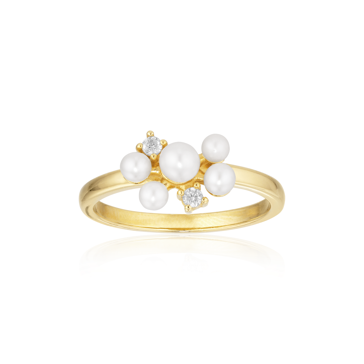 Elegant og tidløs ring fra Alura Copenhagens Eclipse-kollektion, inspireret af fascinerende sol- og måneformørkelser. Ringen er fremstillet i 925 sterlingsølv med 18 karat guldbelægning og dekoreret med en kombination af små ferskvandsperler (ca. 3,2–4 mm) og funklende facetslebne zirkoniaer (ca. 1,7 mm), som giver et sofistikeret og feminint udtryk. Denne ring tilføjer et subtilt glimt til både hverdag og fest og fås i flere størrelser, så du kan finde den perfekte pasform.