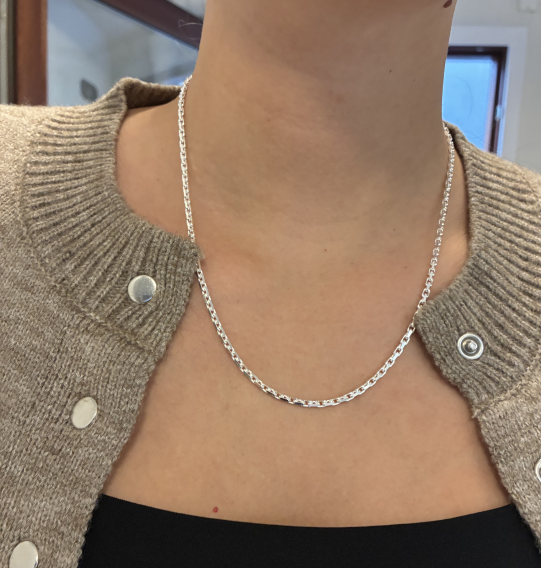 Klassisk Anker Facet kæde i massivt 925 sterling sølv. Kæden er danskproduceret hos BNH - efter gode gamle håndværks traditioner og er fremstillet som facetslebne(kantede) led, der sidder inde i hinanden og giver et råt look og flot farvespil når lyset reflekteres i facetterne. Kæden fås som armbånd og halskæde i flere bredder og længder og bliver leveret enten med fjederlås eller karabinlås afhængig af bredden på kæden.