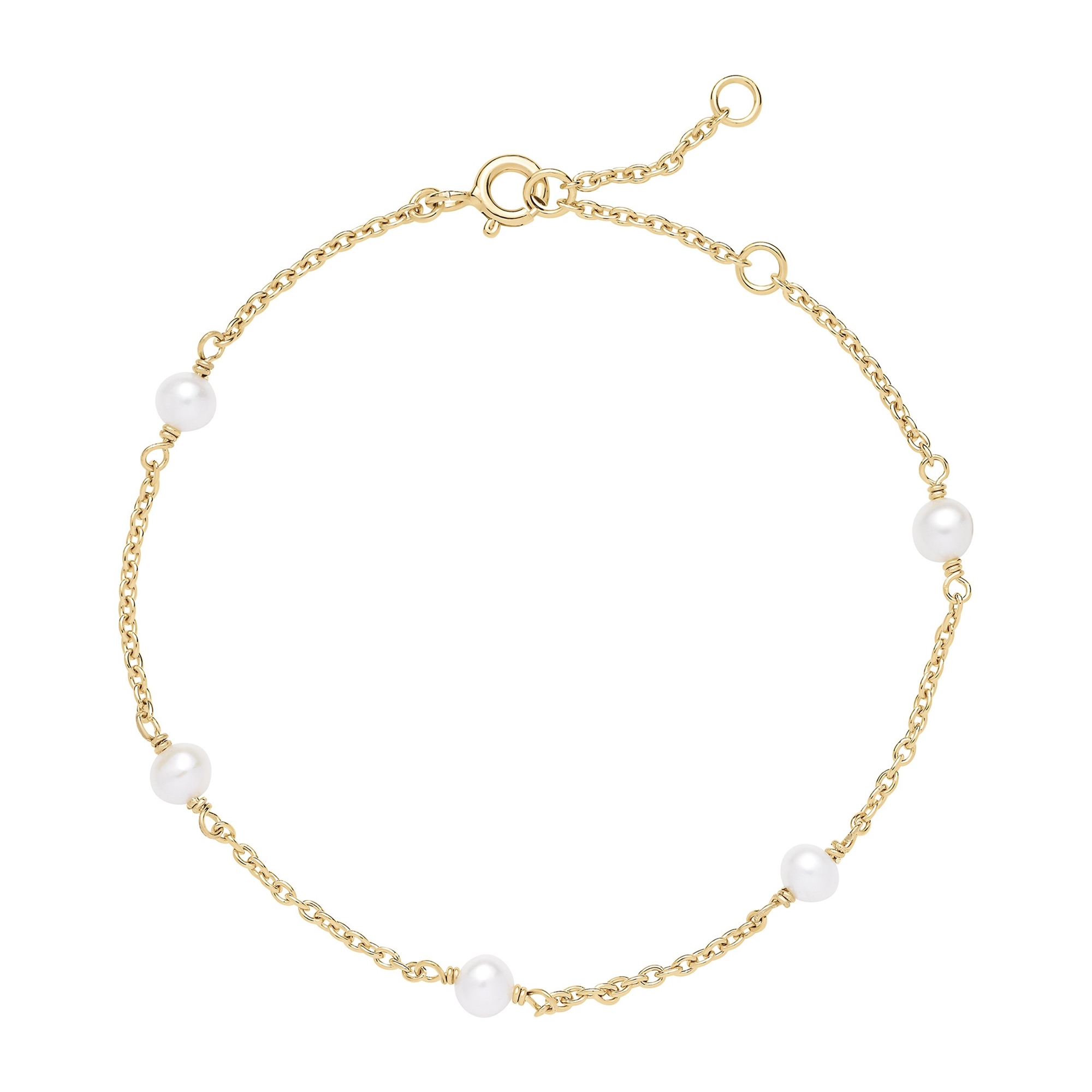 Dette forgyldte sølvarmbånd er udsmykket med fem skinnende ferskvandsperler, der tilføjer et naturligt og organisk touch. Justerbar i længden, sikrer det en perfekt pasform for alle. Det er ikke kun et smykke, men en fejring af klassisk skandinavisk design og håndværk.