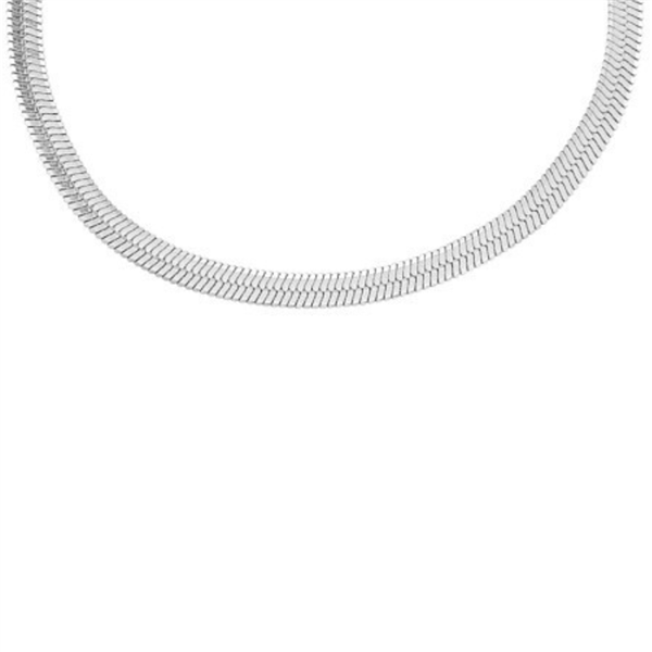Slangehalskæde i stål, et smukt og klassisk design. Halskæden er 5 mm bred og længden er 42 cm + 3 cm forlænger.