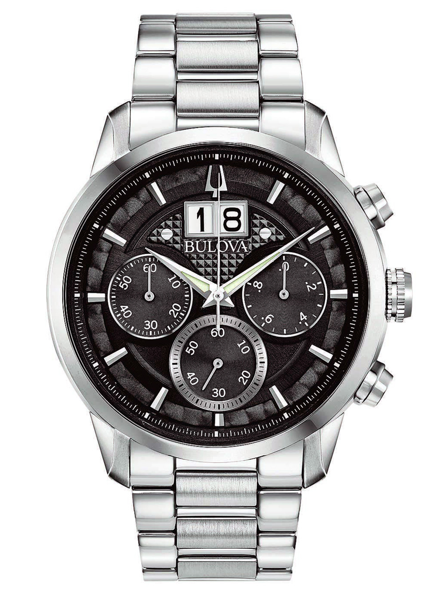 Sort urskive med tre underurskiver, datovisning og metalrem. "Bulova" vises tydeligt på urskiven.