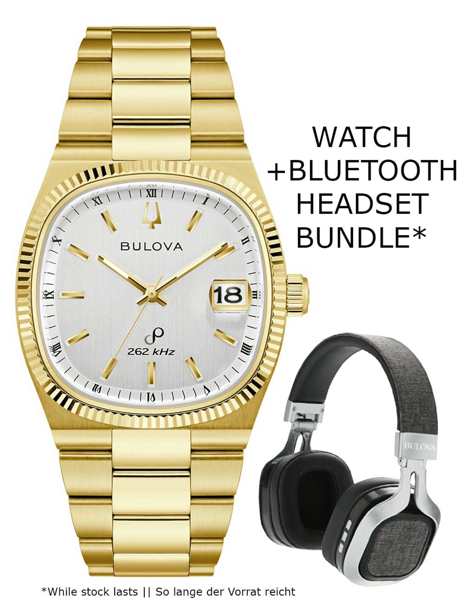 Guldur med hvid urskive, datovisning kl. 3, tekst "BULOVA", "262 kHz". Inkl. hovedtelefoner.