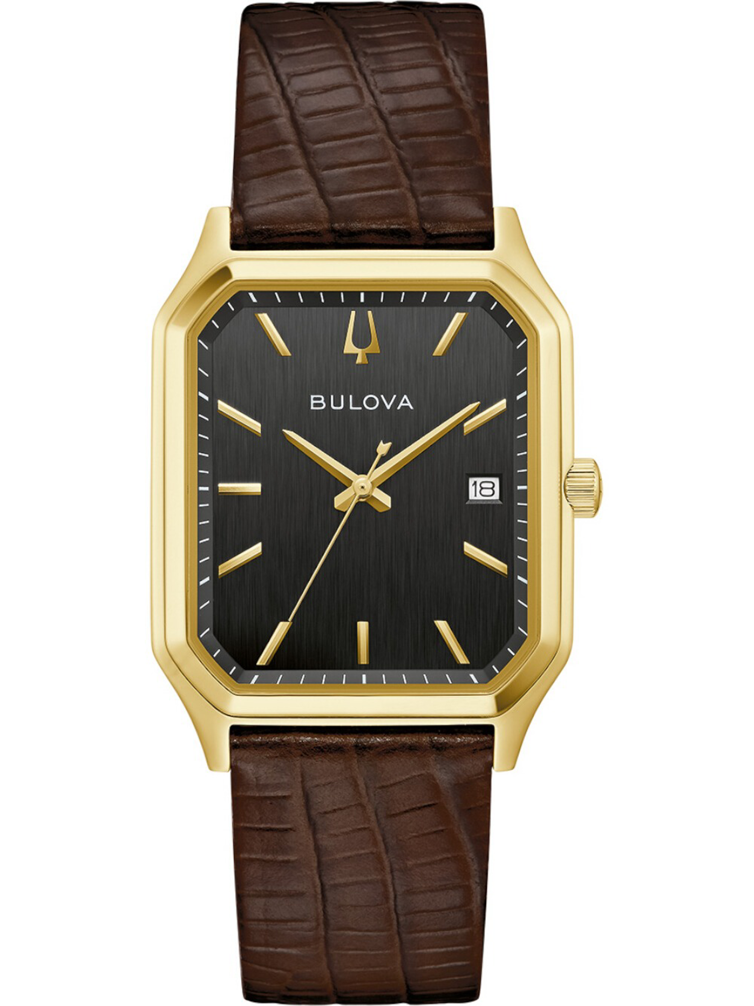 Dette Bulova-ur kombinerer håndværksmæssig kvalitet med praktisk funktionalitet. Den rektangulære urkasse i guldfarve og den mørke urskive giver et udtryk, der passer til både hverdag og særlige anledninger. Uret er fremstillet i rustfrit stål.
