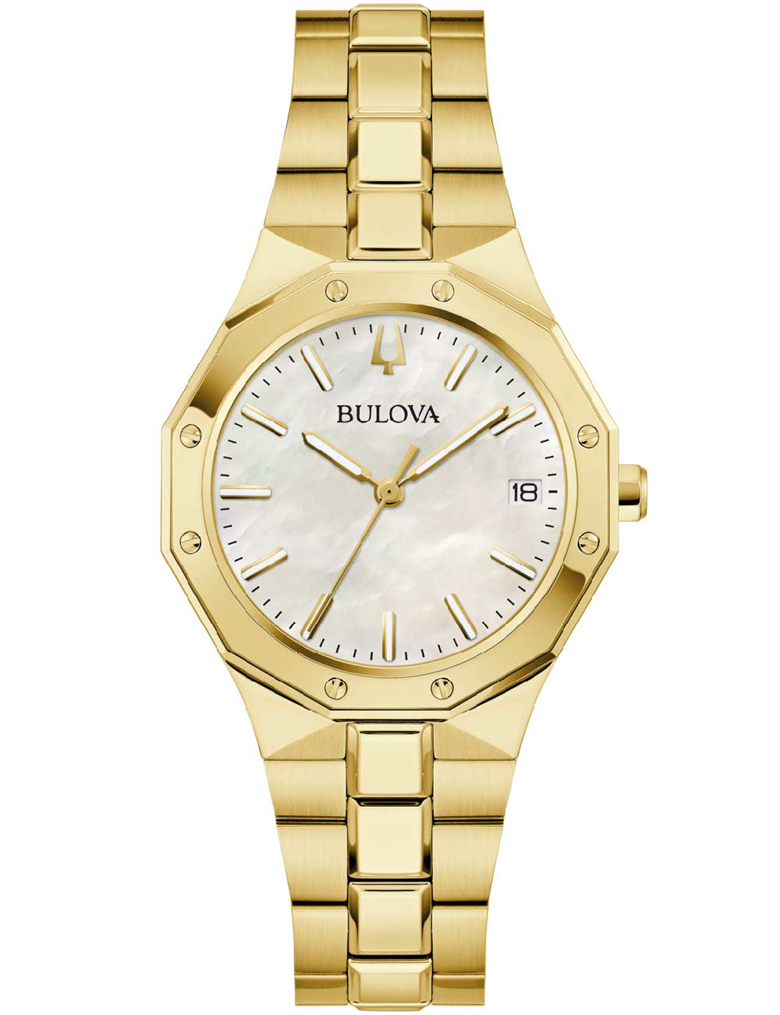 Guldfarvet Bulova dameur med perlemorsurskive, guldfarvet rem og dato ved kl. 3.