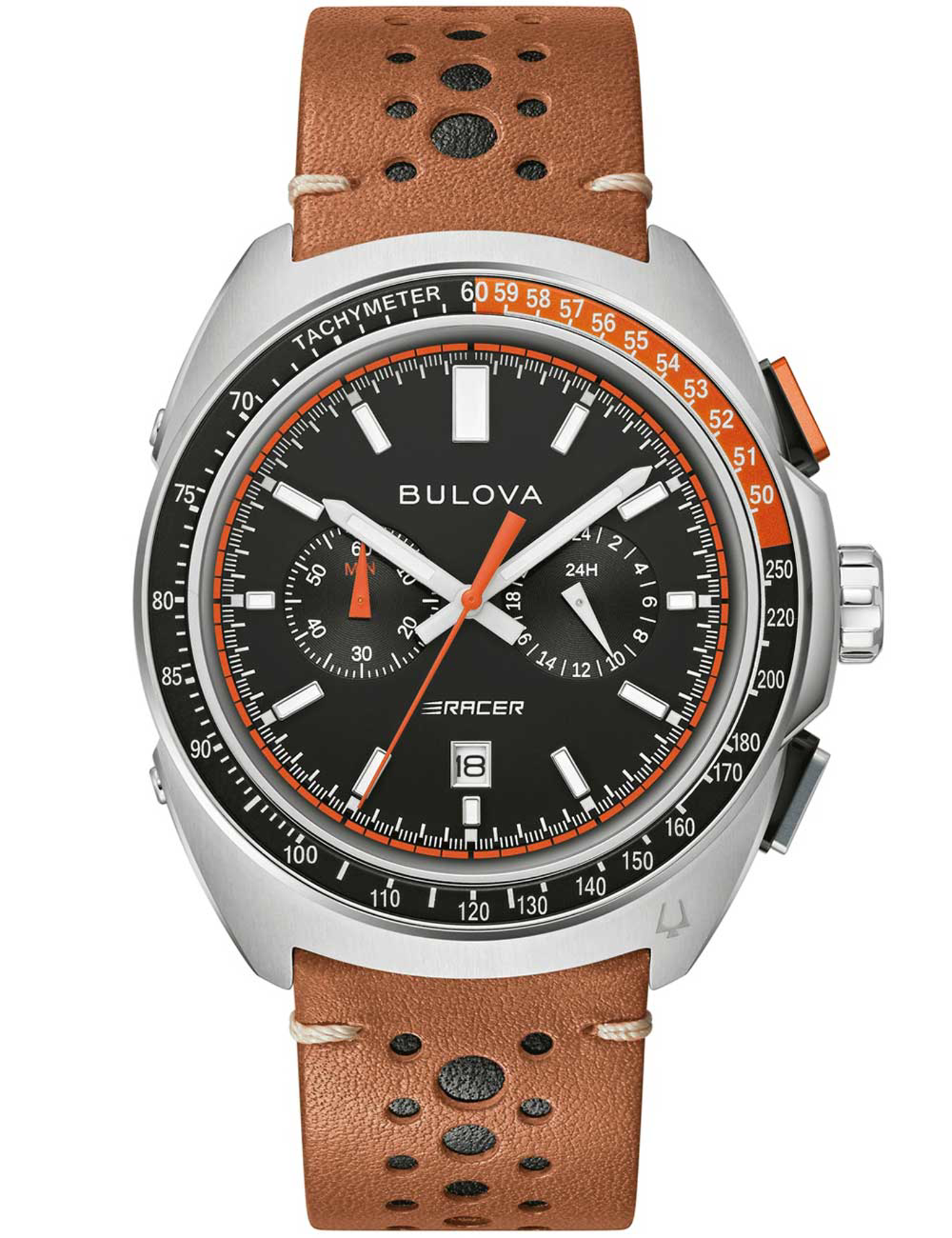 Bulova herreur med sort urskive, sub-dials, tachymeter, datovisning og brun læderrem med huller.