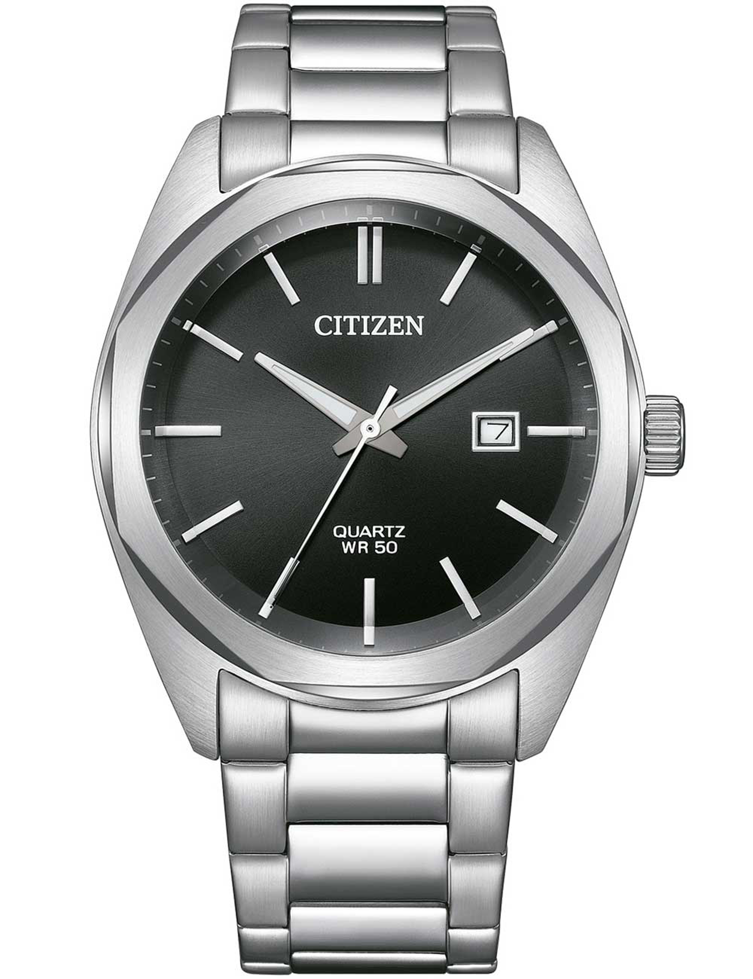 Citizen herreur med sort skive, sølvmarkeringer, datofelt kl. 3, tekst "QUARTZ WR 50", 5 ATM.