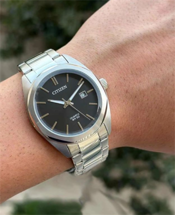 Citizen herreur med sort skive, sølvmarkeringer, datofelt kl. 3, tekst "QUARTZ WR 50", 5 ATM.