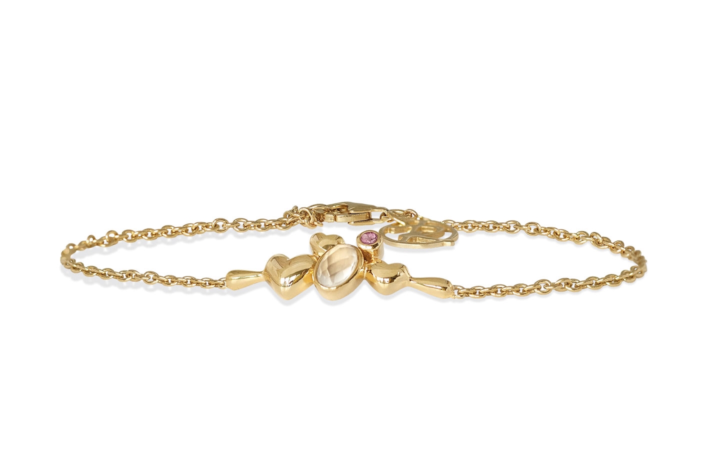 Dette Rabinovich armbånd forener luksuriøs elegance med tidløst design. Fremstillet i forgyldt sterlingsølv med en strålende 6 x 4 mm hvid månesten, der fanger lyset på en særlig måde. De hjerteformede vedhæng og den delikate 2 mm pink turmalin skaber en subtil elegance, ideel til romantiske middage.