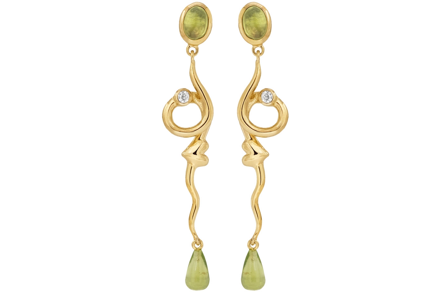 Disse eksklusive øreringe kombinerer en 6 x 4 mm oval peridot med en 7 x 4 mm dråbeformet peridot i et harmonisk samspil. Det snoede design i forgyldt sterlingsølv skaber en dynamisk bevægelse, mens den diskrete 2 mm zirkonia tilfører et subtilt glimt til det kunstneriske udtryk.