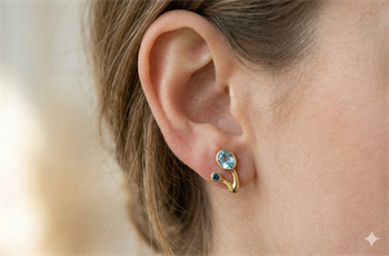 Ørestikken er omhyggeligt fremstillet i forgyldt sterlingsølv, hvilket giver en varm og indbydende glød. Smykket er prydet med en 5x4mm aqua blå kvarts og en 2mm london blå topas, der tilsammen skaber en fængslende blanding af blå nuancer, der minder om havets dybder.
