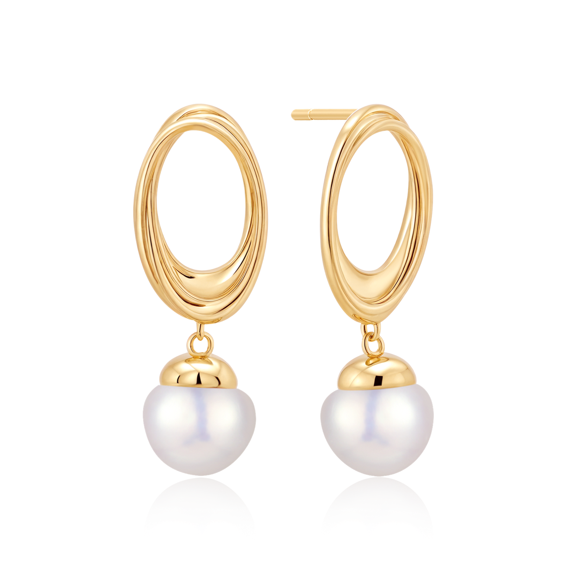 Sølvforgyldt øreringe med ovale hoops og perlelignende vedhæng, post-back lukning.