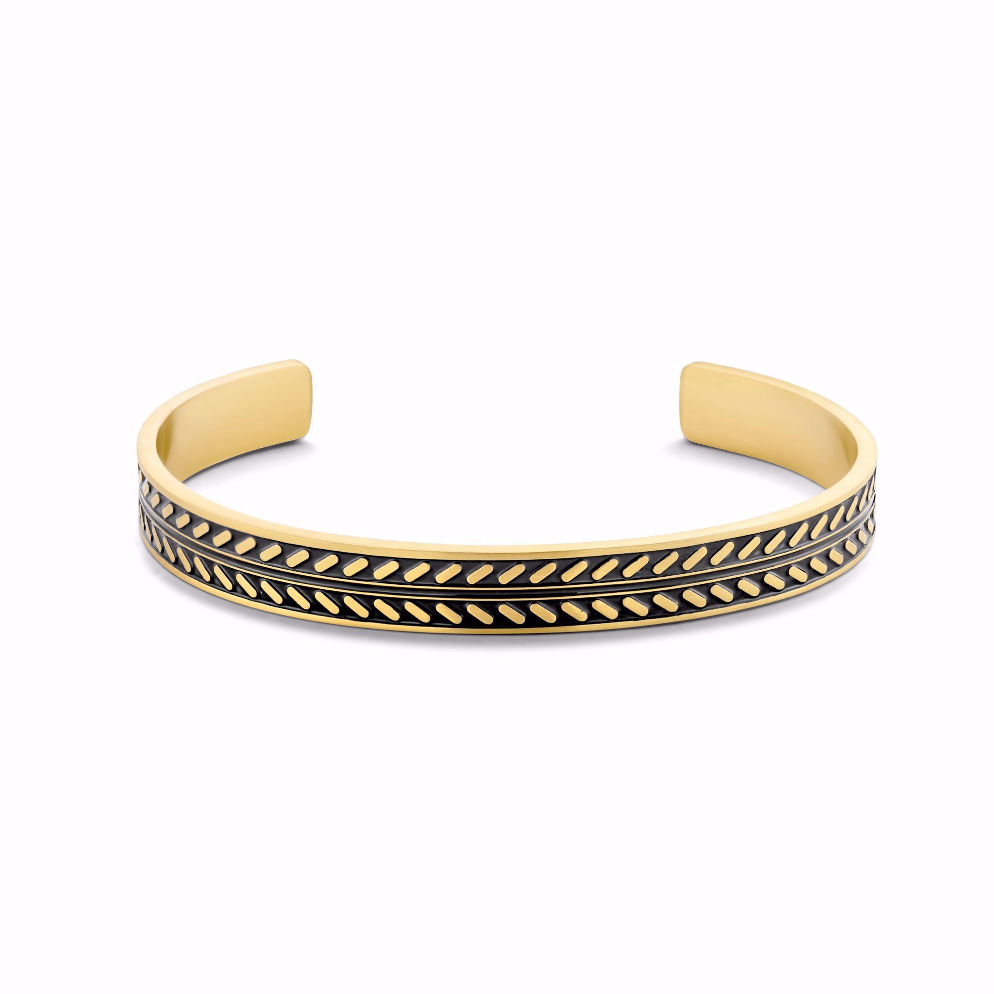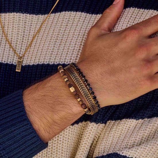 Frank IP guld stål armbånd med sort mønsterindlæg på håndled, sammen med andre armbånd.