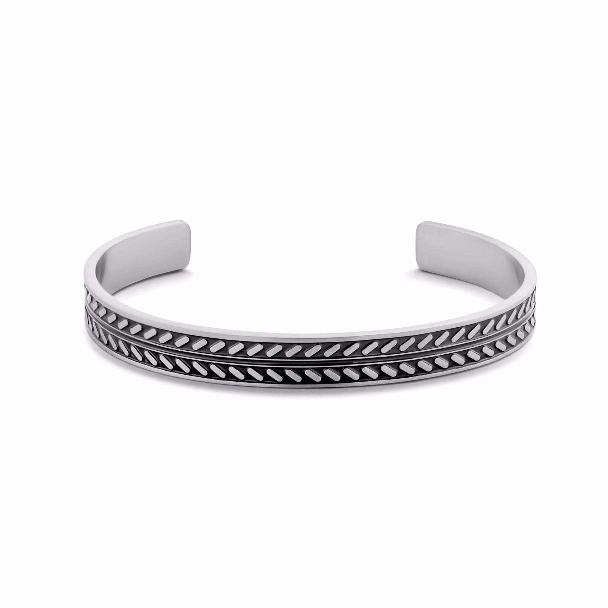 Dette stilfulde stålarmring fra Frank 1967 kombinerer elegant håndværk med praktisk design. Det åbne, justerbare design sikrer en ideel pasform til forskellige håndledsstørrelser, mens det karakteristiske bladmønster skaber et sofistikeret udtryk, der kan fremhæve enhver festlig påklædning.