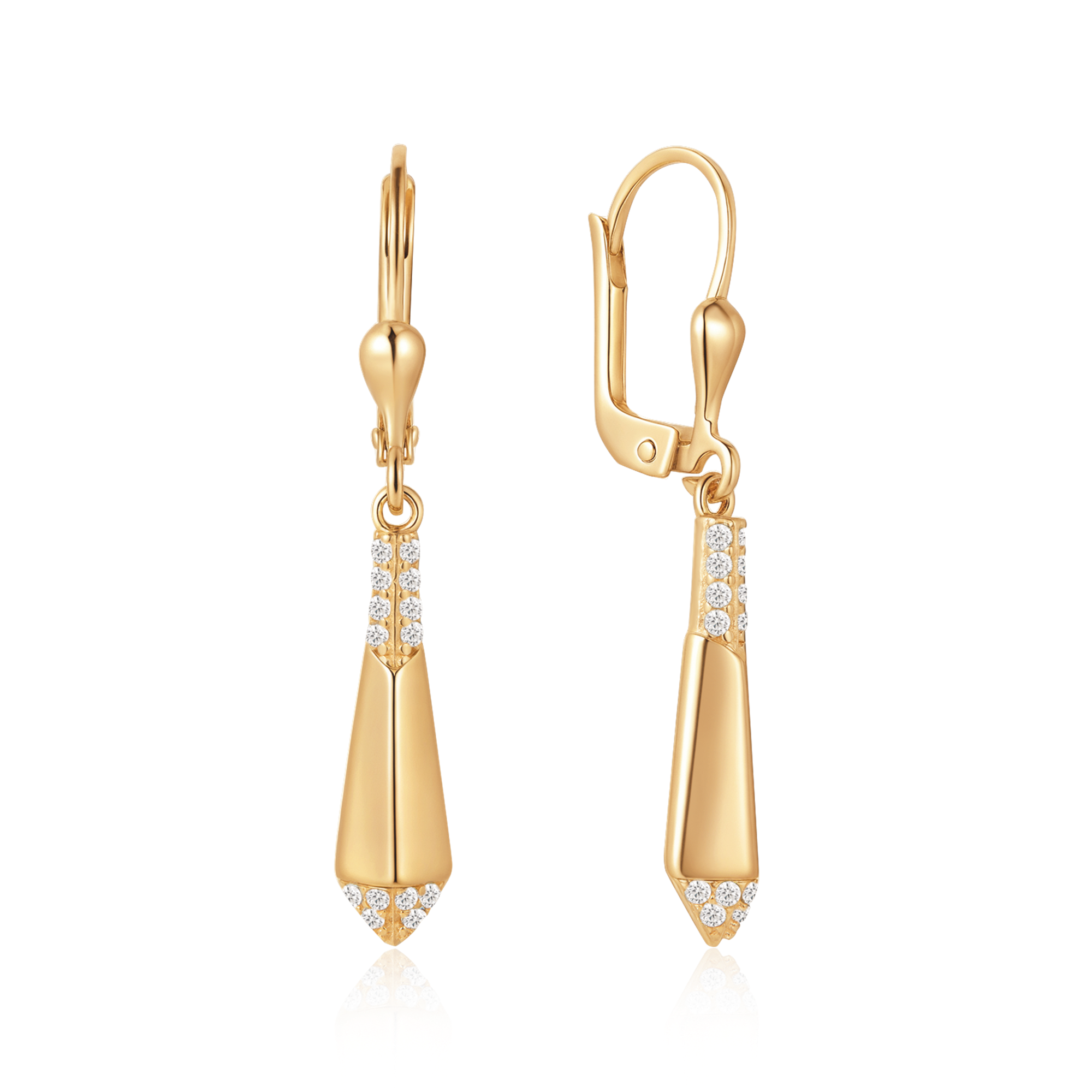 Guld ørehængere med dråbeform og små sten, lever-back lås, fra Støvring Design.